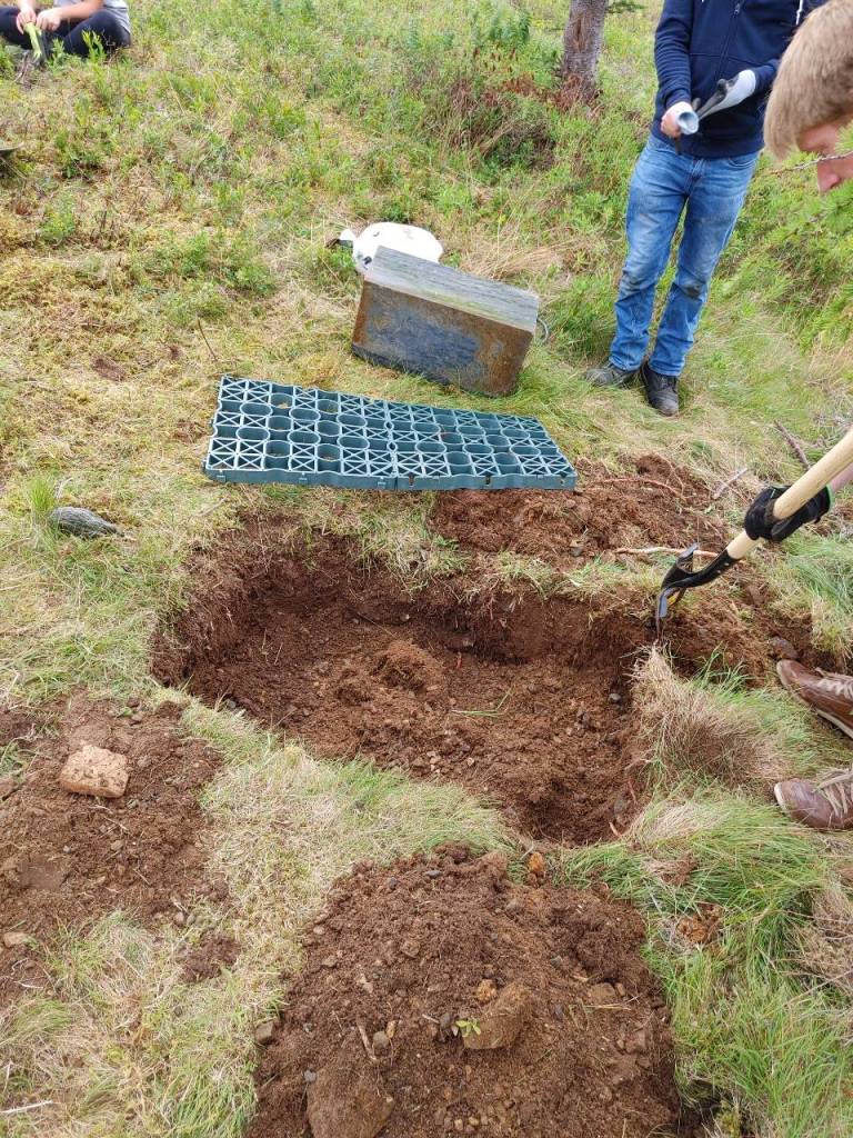 The first step was to dismantle the stones that we were planning to restore that day. This was an extremely long process, because all of these gravestones were set on a foundation of concrete below the surface. This is a huge issue that happened/happens a lot, because the weight of the concrete will cause it to start sinking quite quickly, or tilting, which causes the gravestones to eventually slide off their bases and fall apart, which is what we were dealing with. Digging out the concrete took ages, but was worth it so that we could replace it with a ‘re-enforced soil system’, a monument grid system. We used Monugrid, a Canadian company!
