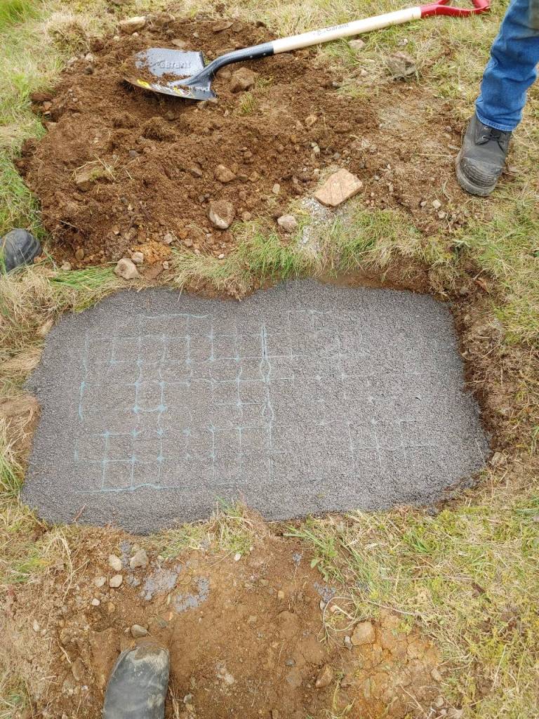The grid has to be larger than the base of the monument, in order to spread out the weight. The grid acts as a snowshoe for the monument, and allows drainage and flexibility in the foundation. We dug out a new foundation hole, and packed it with layers of limestone screening for stability, ensuring each few inches were level as we went. We then placed the grid at ground level, and packed it with more limestone screening, and replaced the bottom layer of the monument on its new foundation. Next, we used a UV stable stone epoxy in small dots to reattach the other sections of the monument, with spacers to ensure the next piece was sitting on a level area.
