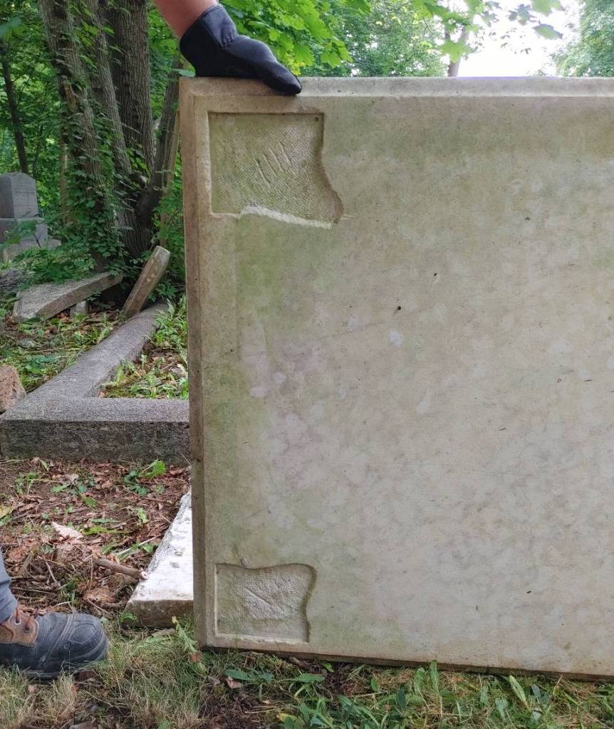 The chest tomb was in multiple, broken pieces when we arrived, so the first thing to do was move the fallen tablet gravestone beside the tomb to make room for all the pieces (don’t worry, we came back and fixed that stone afterwards as well). The interior of the chest tomb was filled with pieces of old bricks, and as we moved them we soon discovered that there was a marble base for the monument below! This is rather rare and was exciting to see. The entire monument seemed to have been put together like a puzzle, with numbers on all the pillars and footings carved into the top and bottom of the marker, and all pieces fitting snuggly together.