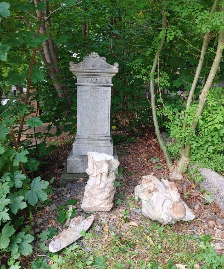 This monument is one that we actually visited in March 2021, on our first visit to the General Protestant Cemetery. I actually pointed at it and said ‘we can fix that’. Is that manifesting? If it is, we’ll take it! This monument has also seen several periods of restoration, but resetting the panels had failed again, so here we are! The monument consists of an ornate base with scrollwork, four exterior panels, a pillar (I’ve been calling it the obelisk, but it doesn’t have the pointy top), and an urn, all made from marble.