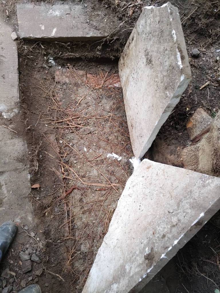 This monument, made from zinc, is dedicated to Isabell Parsons. Unfortunately this marker is partially grown over at the base by the very tree that is causing it to lean outwards, and cannot be moved without machinery. Neither myself or Ian are metal workers either, so we did not undertaking the cold soldering required to reattached the large zinc urn to the top of the monument. What we could do, however, was prepare the new foundation area for the marker to be moved to at the later date by machinery! We achieved this by digging out a level footing area, filling it partially with levelled and tamped crusher dust, and then adding MonuGrid in order to provide a stable and level foundation for the marker. It’s all ready to be moved onto its new home!