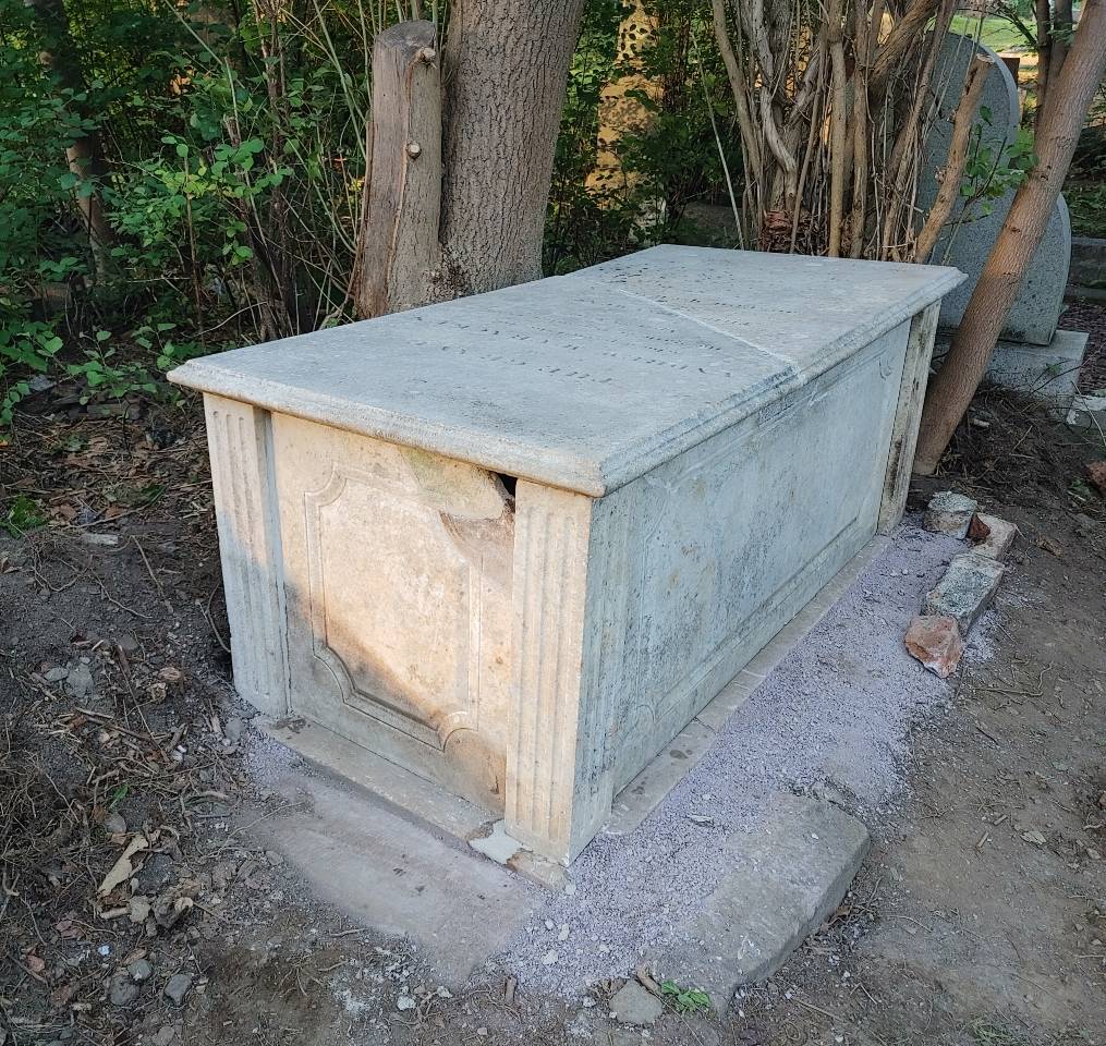 After we pried the base up from the ground, unfortunately in two pieces because it was stuck under the tree and a portion was unable to be recovered, we got a chance to see the original top of the brick-lined grave shaft! It is likely that the bricks inside the monument itself were leftovers! We then levelled everything with tamped crusher dust and got the base reset. That what the biggest struggle really, and from there it was a matter of rebuilding the monument using the handing guide that the original gravestone carvers left for us. The worst piece was the back panel, as it was in the best shape, and therefore the largest and heaviest! After we got the walls and pillars back in place and secured with some stone epoxy, we replaced the loose bricks inside, and moved the ledger pieces back into place. Once the epoxy had all set, we filled in the breaks and cracks using lime mortar, and viola!