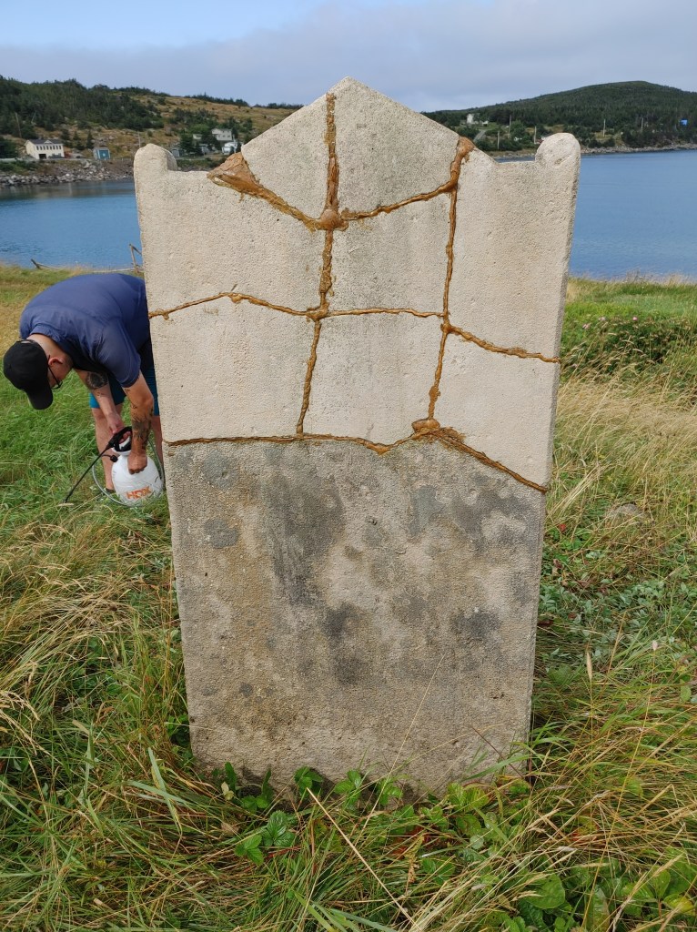 We were contacted by Heritage New Perlican, the local heritage associate, to clean Jane’s gravestone and to try and remove as much of the paint that covers a portion of the surface as possible. This gravestone met an unfortunate fate a number of years ago, after the broken top portions of the stone were taken from the site, glued back together, and painted. While the person who carried out these modifications did so with the best intentions at heart, today we know that irreversible treatments like certain glues, and painting a gravestone, are techniques that we want to avoid because of the damage that they can cause. Unfortunately, paint is extremely difficult to remove from historic stones as there are no paint strippers that are safe to use on historic stone…in other words they would cause damage while removing the paint, which is the opposite of what we strive to do through our preservation practice.