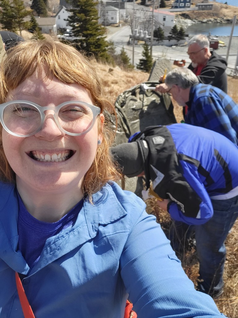 This week we had the wonderful opportunity to head out to Bareneed with the Port de Grave Peninsula Historical Society, to teach some of their seasonal staff how to safely clean and care for their historic burial grounds! We had been trying to find a warm enough day to get out there for weeks, and the April weather finally gave us a little break and some sunshine, so we were able to pack up the car and head over for the day.