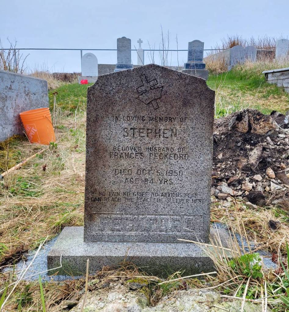 With the amazing fundraising efforts of Linda White, Joy Barfoot, and Ivy Tong, and everyone who donated to the restoration of the cemeteries, we were able to visit Greenspond in early June of this year to begin the work with 10 gravestones in the New Anglican Cemetery, at the ‘top’ of the island. We stayed at the Hub of the North, which gave us an excellent view of the coast and the icebergs bobbing around the island, before the fog rolled in! We wanted to start with this site because there were only 10 stones identified in 2022 that needed work. Unfortunately, due to the extremely cold spring this year, we were unable to work on some of them, as the stone epoxy we use to repair broken tablets cannot set if it’s under 7.C, which it was for the entire time we were there. Still, we made some amazing progress, and were even visited by Adam Walsh and team at The Signal, and were on CBC radio live, along with the heritage society, Greenspond’s mayor, and several other local residents who contribute to the rich life of the community.