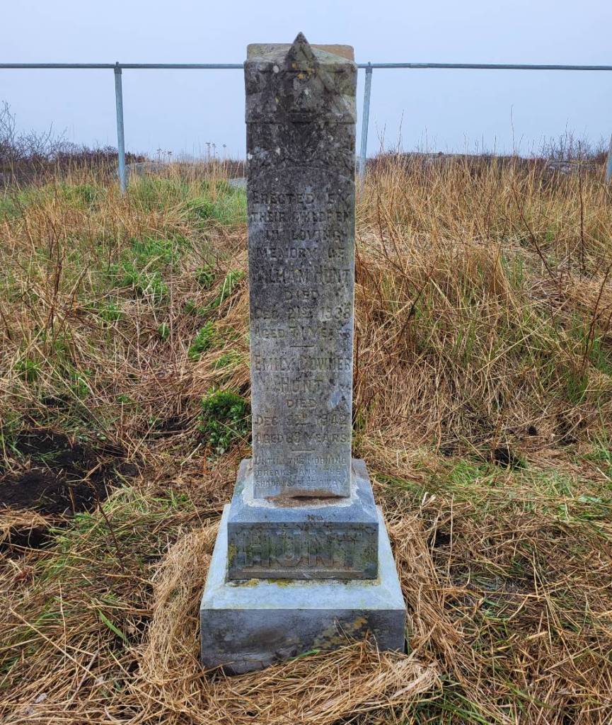 The Hunt gravestone above was similar, although constructed from grey marble rather than an interested composite stone material like the Stephen stone was. As you can see from the photos it is comprised of three pieces, and the concrete base was actually in good condition below the grass, so we reset the stone on its original foundation. We still need to add some adhesive below the top portion, but under its own gravity it is in good shape until we get back (only a few weeks now)!