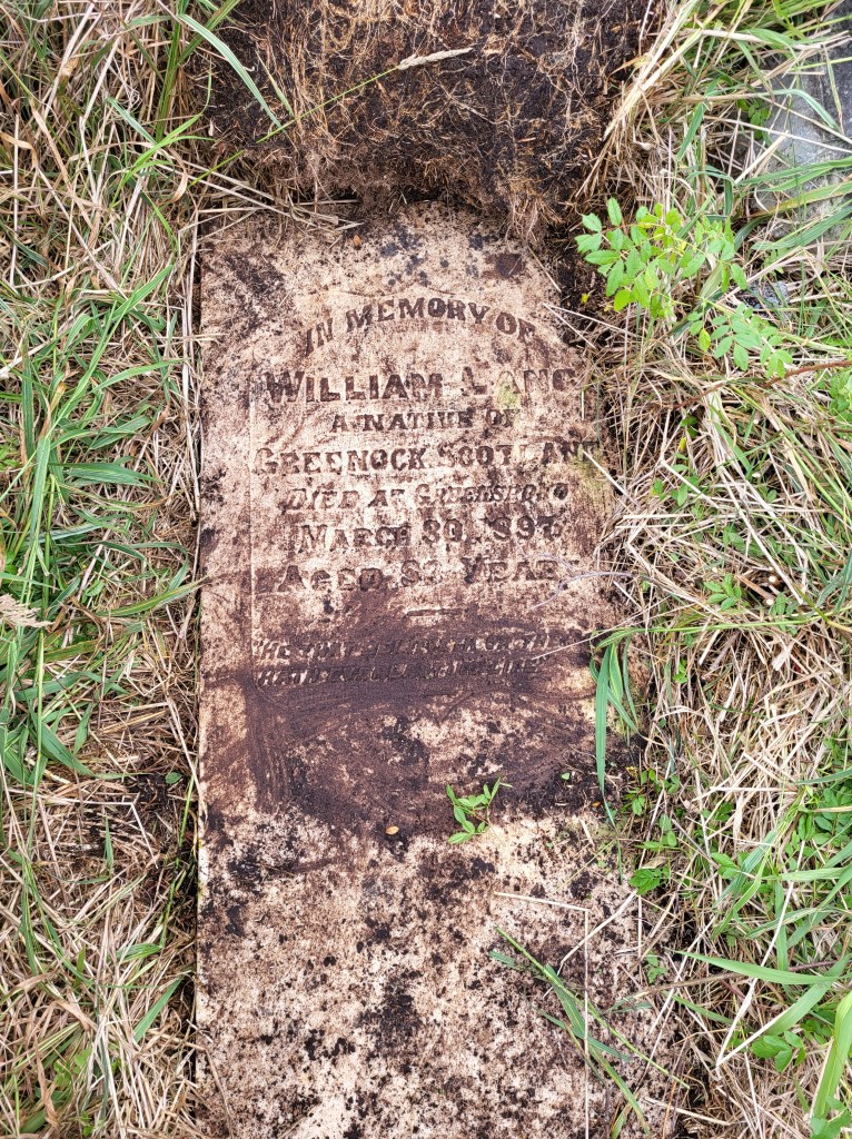 We rolled back the sod mat to find the massive marble ledger dedicated to William Lang, who was born in Greenock, Scotland, and died in Greenspond on March 30th, 1897. It was absolutely stunning, and we were so surprised and excited! We cut back the sod and trimmed the grass around the ledger so that it is visible once again. You can see in the right photo where lichen staining was present around the rectangular monument that had fallen on it. Luckily, no damage was done!
