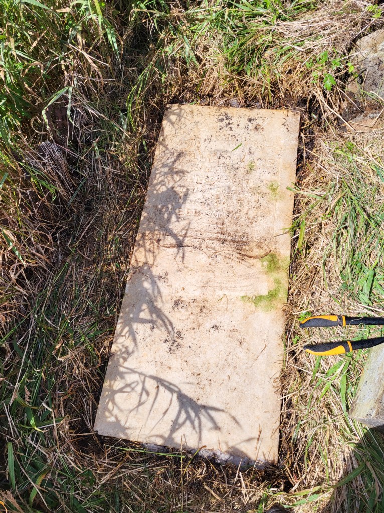 After the first stone near the entrance to the site was finished, a simple levelling job and light cleaning of a lovely white marble stone dedicated to George House, we started the difficult task of restoring the Lang plot. The plot, which you can see in the photos above is encircled in an iron fence, contained four complex monuments, each made up of three pieces of marble, and one with two marble and one sandstone piece. They had all toppled over due to the degradation of the concrete bases that they had been set on top of. You can see in the left-hand photo that the bottoms of the bases were nearly level with the top of the fence, but that they are leaning backwards. The 4th monument, not pictured, was topped to the side as the concrete had fallen away and the stone rolled off a boulder that was below the base. When we moved the top portion of that monument, we realized it was sitting on top of a surprise 5th monument!
