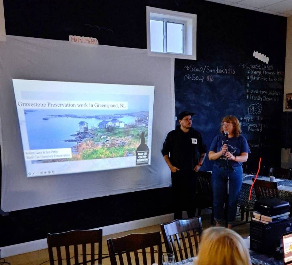 On Wed, August 30th, we met the Greenspond Historical Society and community members at the Hub of the North restaurant to give a presentation on the work we’ve done so far, safe headstone cleaning and care, and to meet everyone and answer any questions they might have! We had a really great turnout, with visitors and locals joining us for a 45 minute talk and tons of chatting afterwards. Thank you to Darren of the 709 Watershed Podcast for taking some great photos of the event!