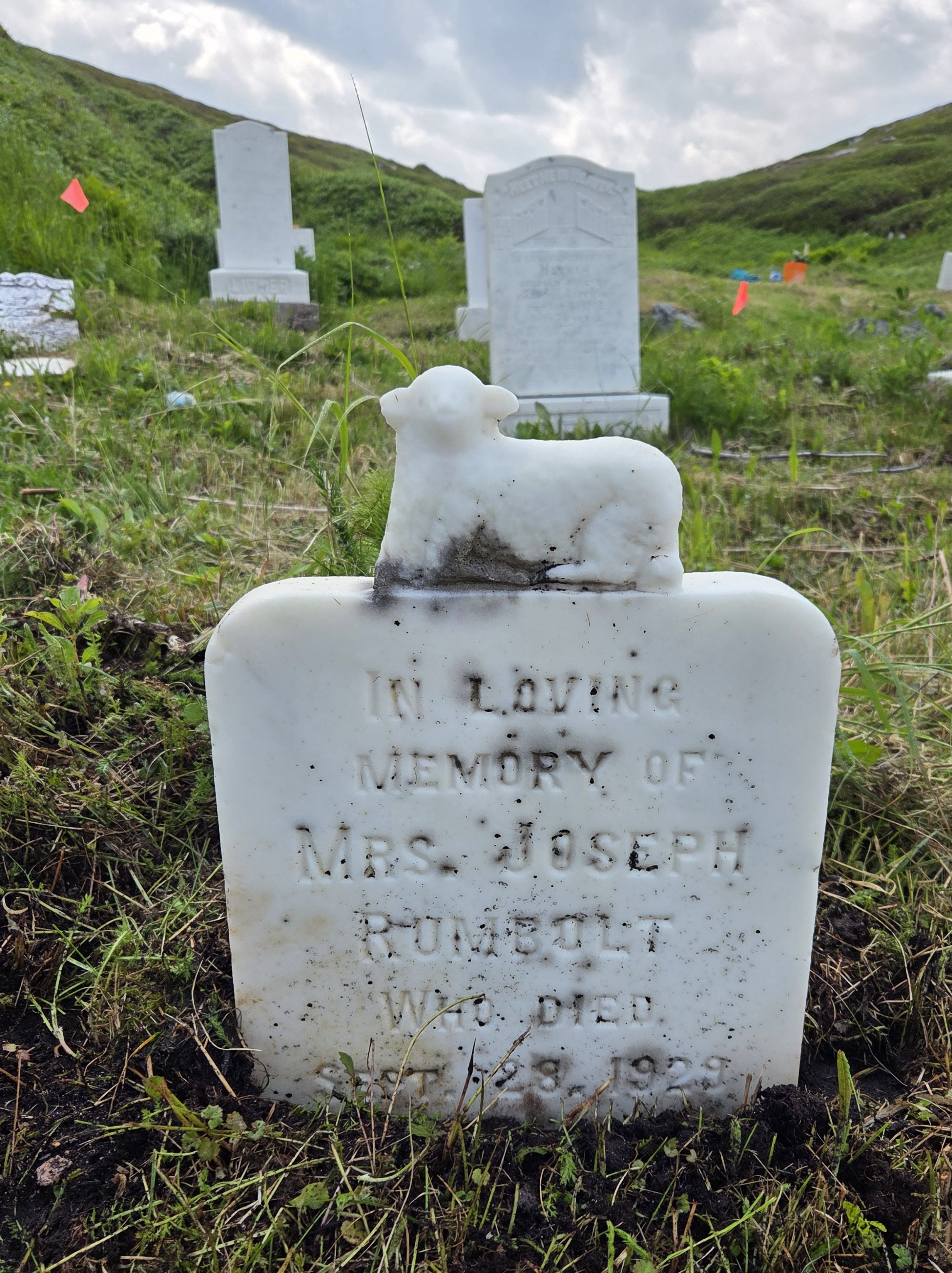 Another notable stone we wanted to highlight is that of ‘Mrs. Joseph Rumbolt’, who died in 1929 at the age of 19 years, 8 months. This stone is particularly heartbreaking. It is decorated with a carving of a lamb on the top of the stone, in line with two other similar gravestones with lambs on top, one to another 19 year old, and an 11 year old. Lambs are typically used for the graves of children, denoting a ‘lamb of God’. They are also found on adults graves, but it is less common. This gravestone, however, does not have the name of the woman on it, but only refers to her as ‘Mrs. Joseph Rumbolt’, her husband’s name. Not only that, but her age lists the months as well, something which is typically reserved for children. I’ve been trying to locate her first name and maiden last name, but so far I haven’t been able to find her. If anyone knows Mrs. Rumbolt’s first name, I’d love to be able to update this post with that information!