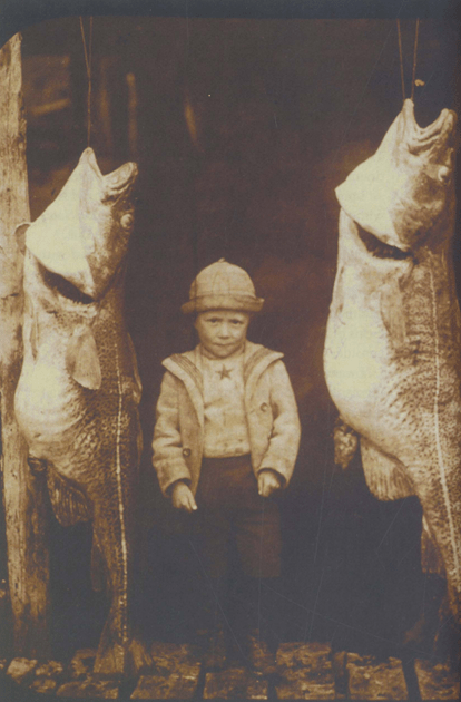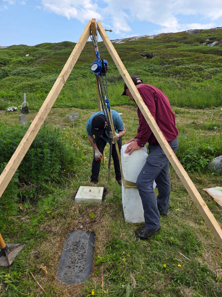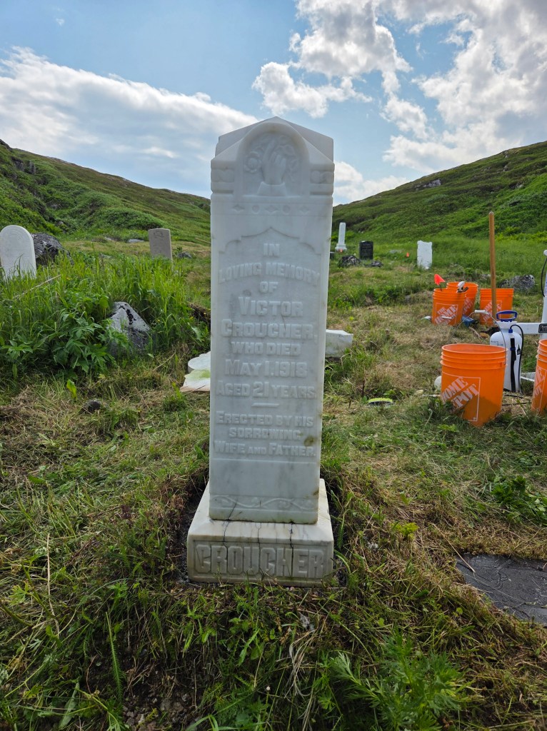 The most notable grave at this cemetery is Victor Croucher, well known for being imortalized in Newfoundland history at the age of three when he was photographed between two king cod hanging at the pork storehouse n 1901, by photographer Robert Holloway (father of Elsie Holloway). Our first task at this site was to reset Victor’s gravestone, which had fallen from its base years before. Below is a photo of Peter Bull helping Ian reset the stone with our tripod, and one of the versions of the famous photo, from THIS (click here, pg 18) article in the Newfoundland Quarterly, and finally Victor’s stone reset and cleaned! Victor was well loved in his community, and tragically died during a bird hunting accident when he was only 21 years old. The bottom of his epitaph reads: “Erected by his sorrowing Wife and Father’. It was an honour to restore his gravestone.